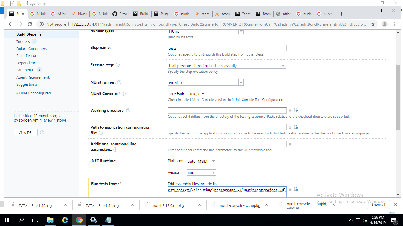 然后建筑停止了。在“失败条件”下。我们的NUnit康索尔是3.10.0。
