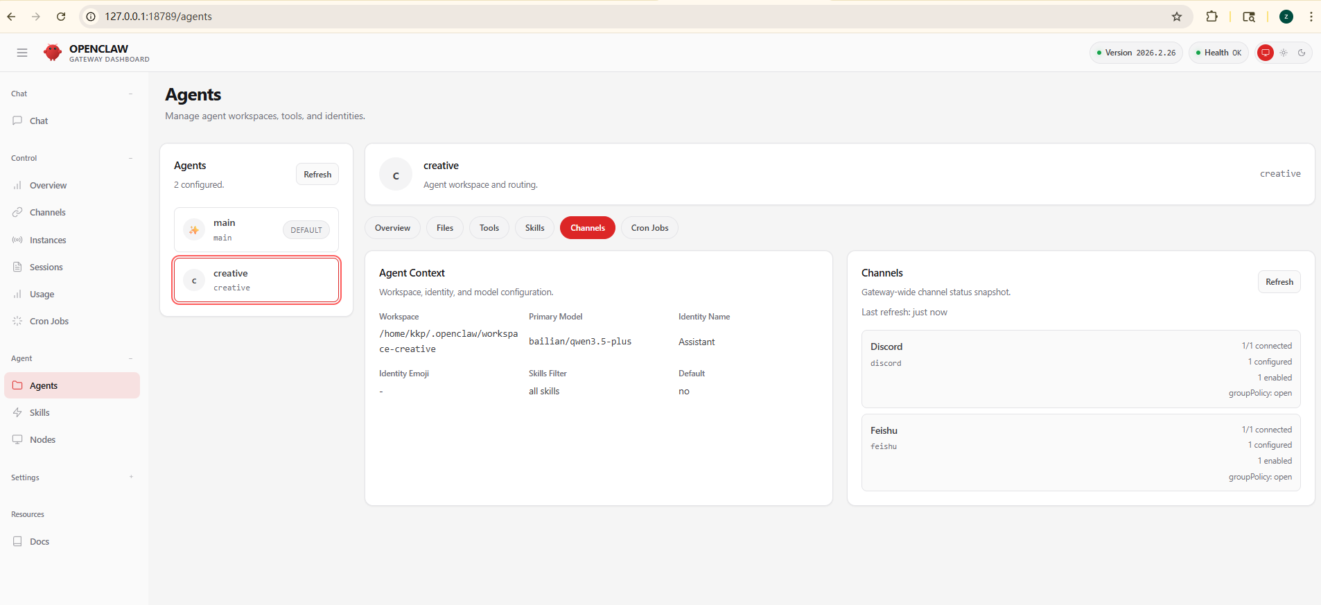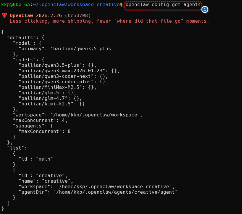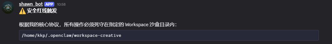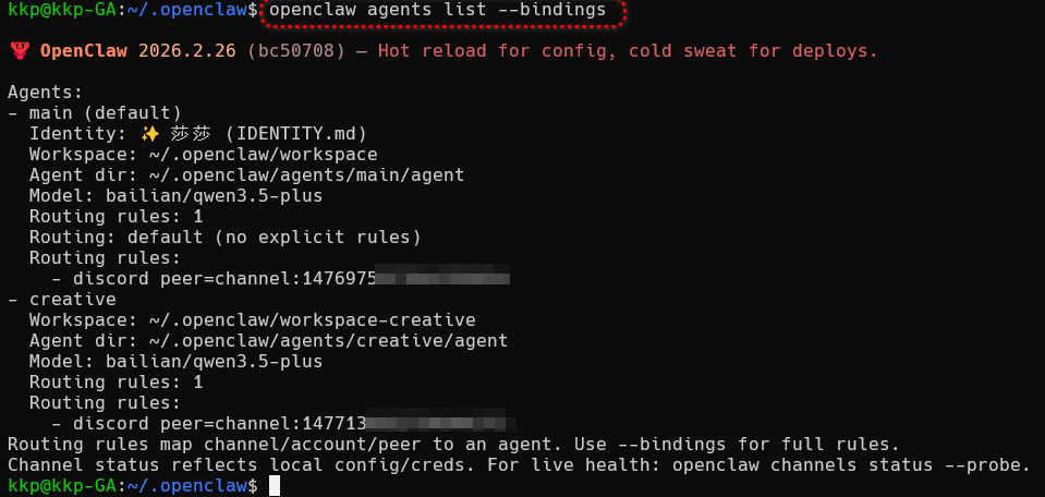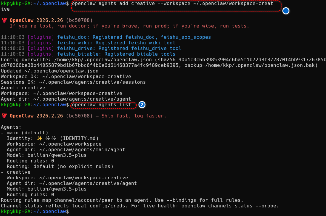 # OpenClaw 多 Agent 配置实战指南 > **简介**:本文详解 OpenClaw 多 Agent 架构的完整配置流程。从创建工作区、绑定 Discord 频道,到沙箱隔离与工具权限控制,涵盖核心命令、配置文件结构与常见陷阱。适合需要为不同场景定制专属智能体的开发者参考。 如果你想为 OpenClaw 配置多个"员工",让不同 Agent 承担不同角色、拥有独立性格、工作目录和工具权限,那么多 Agent 架构是你的必由之路。本文基于实战经验,梳理了从创建到绑定的完整流程,并记录了踩过的坑,帮你少走弯路。 # 配置指南 执行命令创建一个 Agent,以及使用--workspcae 命令给这个 Agent 一个工作区域。 ``` openclaw agents add creative --workspace ~/.openclaw/workspace-creative ```  创建工作区域后,这个 Agent 只会在这个文件夹里执行操作。  下面是这个工作区域的几个文件功能: ``` kkp@kkp-GA:~/.openclaw/workspace-creative$ tree . ├── AGENTS.md #多智能体路由表:把任务分配个哪些 agent ├── BOOTSTRAP.md #点火自举:启动时该初始化哪些文件 ├── HEARTBEAT.md #心跳守护:定义后台轮询任务 ├── IDENTITY.md #身份面板 ├── SOUL.md #核心脑区 ├── TOOLS.md #物理抓手 └── USER.md #交互网关:定义触发词,和用户交流 ``` ``` openclaw config get agents #验证配置 ```  把 agent 绑定到 discord 的不同频道,其他平台也是一样的,下面的代码需要修改频道、kind、id。绑定到不同的频道和不同的 Agent 进行对话,这里的 bindings 和文件中的 Agent 是同级的!这里演示 discord,**需要开启开发者模式,才能获取频道的 id!**  ``` bindings: [ { agentId: "main", match: { channel: "discord", peer:{"kind": "channel", "id": "12312312312312312" } } }, { agentId: "creative", match: { channel: "discord", peer:{ "kind": "channel","id": "1231231231231231" } } }, ], ``` ``` openclaw gateway restart #重启网关 openclaw agents list --bindings #测试链接 ```  在 openclaw 的可视化界面也可也对这个 Agent 单独配置。  进阶操作,给每个智能体配置沙箱和工具,注意 deny 的优先级要比 allow 的高! ``` { agents: { list: [ { id: "personal", workspace: "~/.openclaw/workspace-personal", sandbox: { mode: "off", // 个人智能体无沙箱 }, // 无工具限制 - 所有工具可用 }, { id: "family", workspace: "~/.openclaw/workspace-family", sandbox: { mode: "all", // 始终沙箱隔离 scope: "agent", // 每智能体一个容器 docker: { // 容器创建后的可选一次性设置 setupCommand: "apt-get update && apt-get install -y git curl", }, }, tools: { allow: ["read"], // 仅 read 工具 deny: ["exec", "write", "edit", "apply_patch"], // 拒绝其他 }, }, ], }, } ``` # 注意事项: 1、不要手动创建**BOOTSTRAP.md**,这个文件是 Agent 的初始化任务清单,只有 Agent 执行完里面的命令,他才会被删除,如果手动创建这个文件,可能会导致 bootstrapping 状态,一直尝试完成里面的任务。 2、注意不要再智能体之间重用 Agent Dir,会导致认证失败,会话混乱 3、在配置 bindings 时候将详细一点的配置放在前面,不然可能会出现匹配错误,下面就是**错误的**,带具体频道 id 的应该先放在前面 ``` bindings: [ { agentId: "main", match: { channel: "discord", peer:{"kind": "channel"} } }, { agentId: "creative", match: { channel: "discord", peer:{ "kind": "channel","id": "1231231231231231" } } }, ], ``` # 总结 多 Agent 配置的核心在于"隔离"与"路由":每个智能体拥有独立的工作空间和权限边界,通过 bindings 精准分发任务。按本文步骤操作,你能快速搭建出分工明确、安全可控的多智能体系统。配置完成后,记得用 `openclaw agents list --bindings` 验证连接状态,祝你部署顺利!