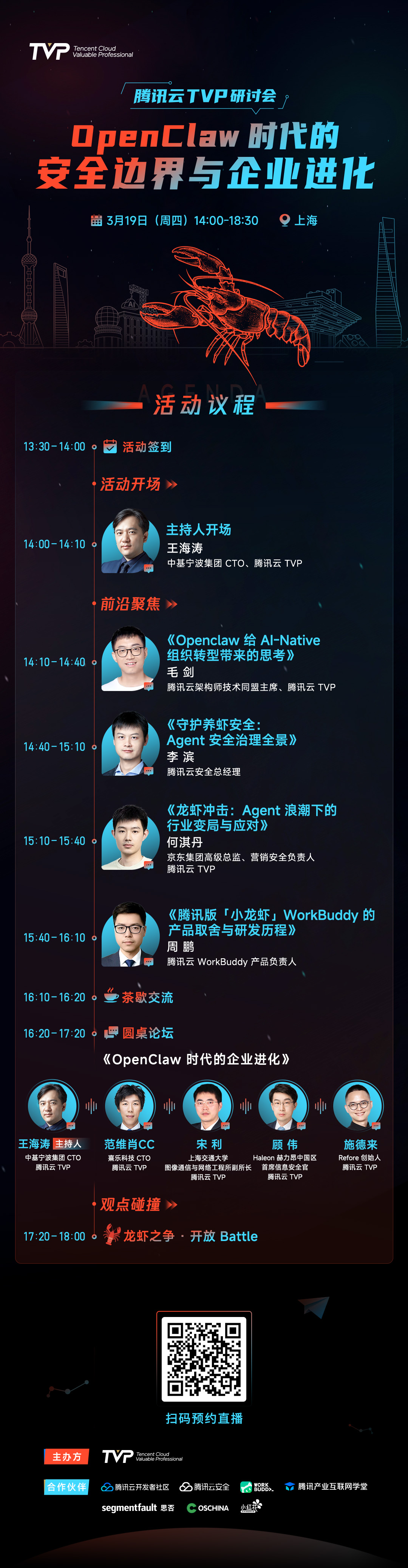 本次「OpenClaw 时代的安全边界与企业进化」TVP 研讨会由腾讯云 TVP 主办,聚焦 OpenClaw 生态下的企业级落地难题与安全挑战。活动特邀多位行业专家及技术大咖,从安全治理、组织转型、行业变局到产品实践,多维度拆解 Agent 时代的核心命题。